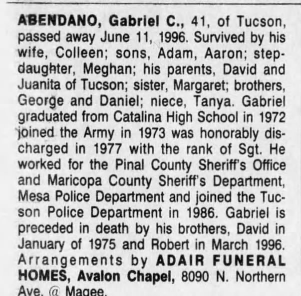 Abendano, Gabrriel C., 41, of Tucson, passed away June 11, 1996.