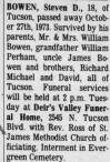 Bowen, Steven D., 18, of Tucson, passed away October 27th, 1973.