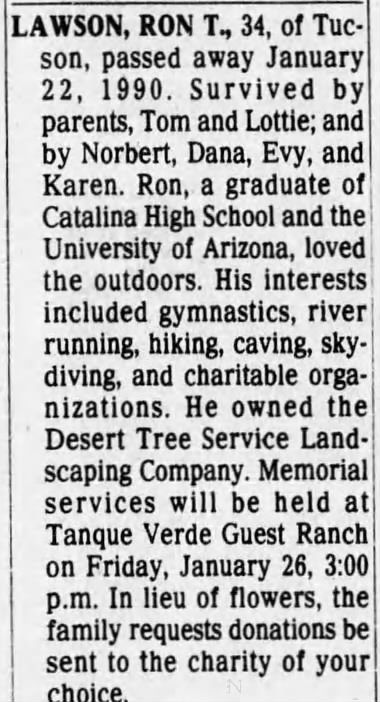 Lawson, Ron T., of Tucson passed away January 22, 1990.